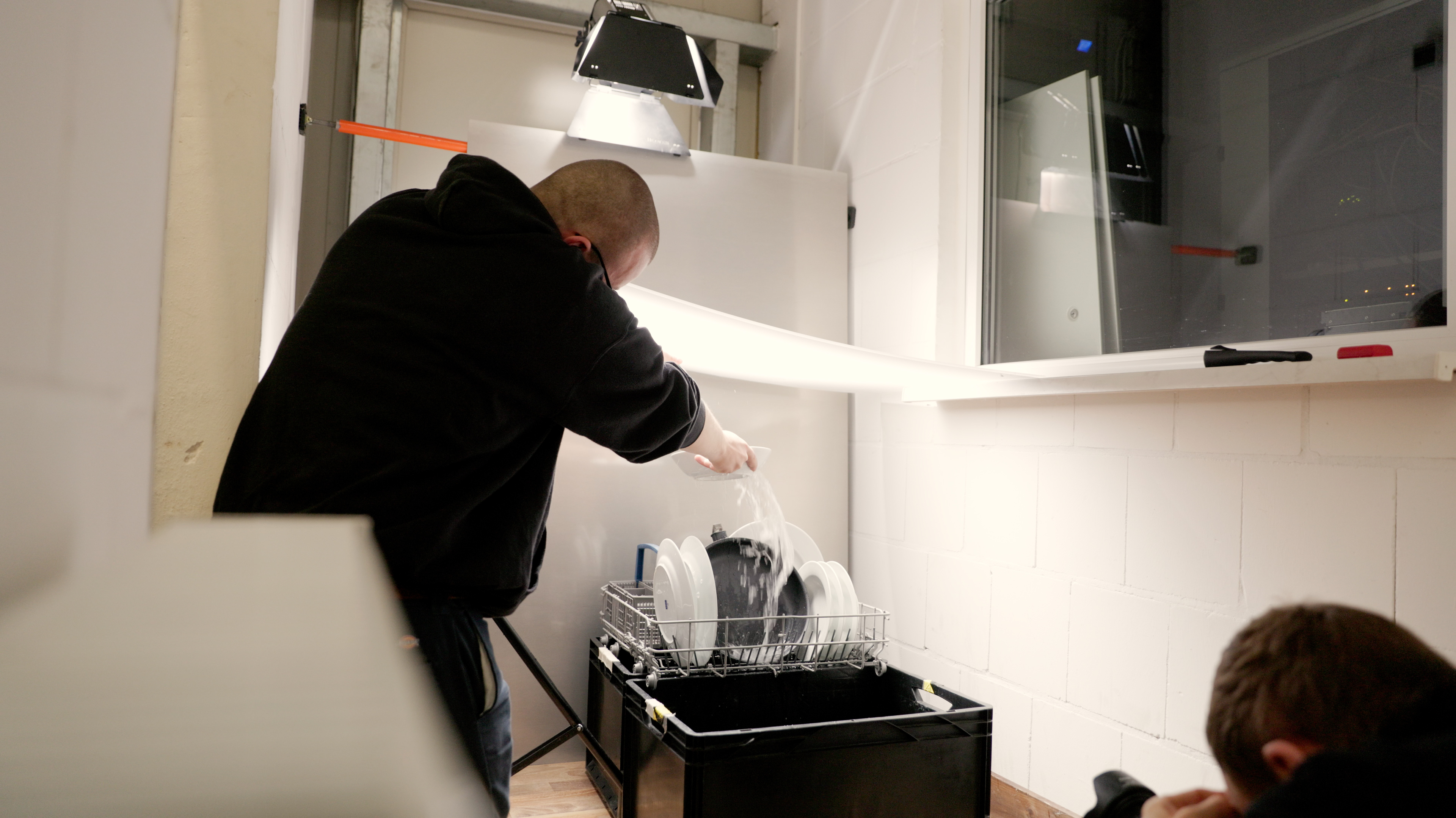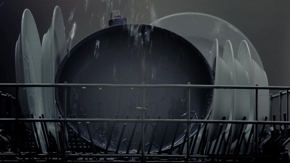 Um zum Beispiel aufzuzeigen, dass die X-Pan Pfannen spülmaschinenfest sind haben wir eine Spülmaschine bei uns im Studio in Lage nachgebaut. Ruck zuck werden eine Alu-Platte, ein Spülmaschinenkorb, eine Plastikwanne und der Gartenschlauch, mit etwas Erfindergeist zu einer 1A Spülmaschine. Die ermöglicht uns den entstandenen Shot, bei dem es aussieht als befände sich die Kamera samt Pfanne und Geschirr in einer wirklichen Spülmaschine.